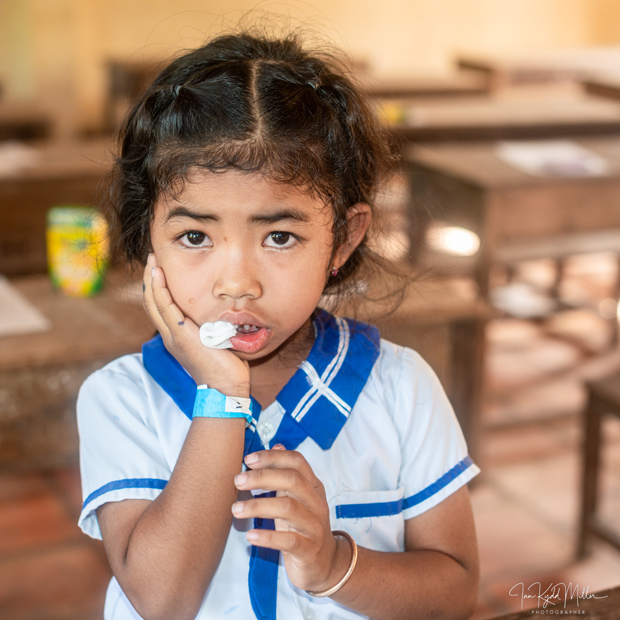 - Srey Leak, eight, has missed school because of an infected molar. A gentle extraction relieves her suffering. Later, she returns with her younger brother Dara, terrified but reassured by her whispers. He leaves grinning, a sticker on his shirt, his fear replaced by pride.